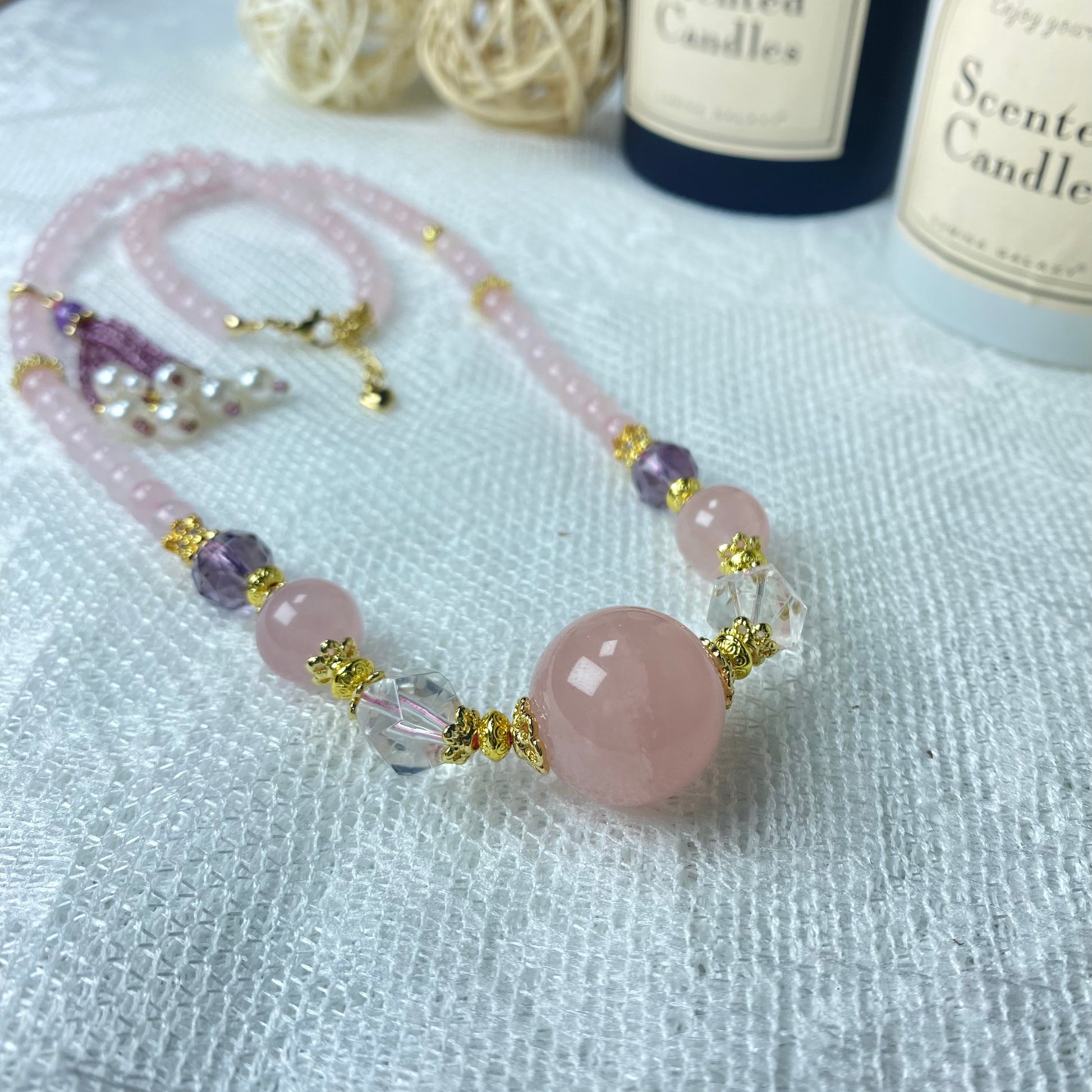 • Main Chain: 6mm pink rose quartz beads, like morning dew on cherry blossoms, glow with ethereal veils of cloud-like inclusions, as if capturing the breath of an entire orchard.